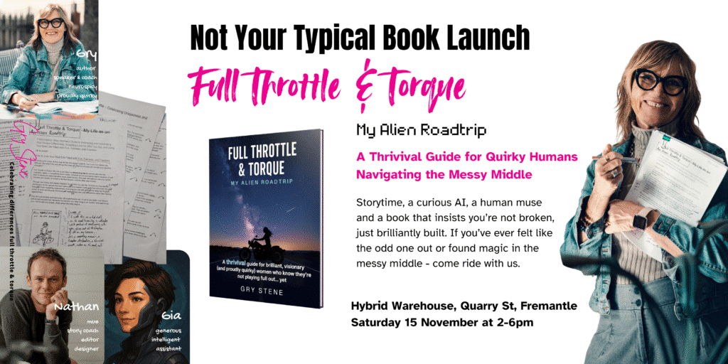 Photos and assets relating to Gry’s book Full Throttle and Torque: My Alien Roadtrip